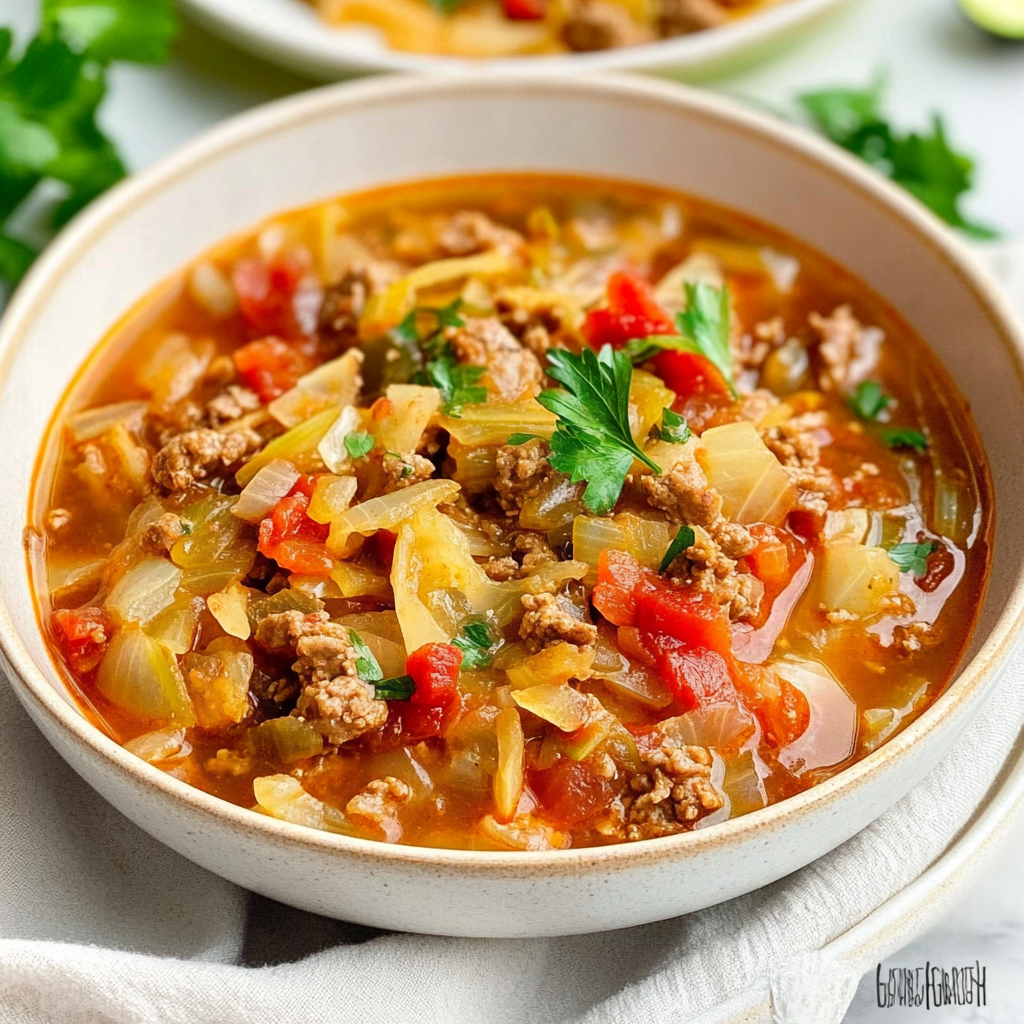 Cabbage Soup with Ground Beef is a heartwarming dish that combines savory flavors and wholesome ingredients into a delightful meal. This comforting soup features tender ground beef, crunchy cabbage, and aromatic spices simmered to perfection. Perfect for chilly nights or busy weekdays, this dish is not only quick to prepare but also customizable to suit your family’s tastes. Serve it steaming hot for a nourishing bowl of joy that warms both the heart and the home.