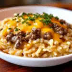 Creamy Garlic Butter Beef and Cheddar Rice is an indulgent, one-pot meal that brings comfort to your table. This dish features tender ground beef simmered in a rich garlic butter sauce, combined with fluffy rice and melted cheddar cheese. Perfect for busy weeknights or special occasions, it’s sure to become a family favorite. With its creamy texture and savory flavors, every bite feels like a warm hug!