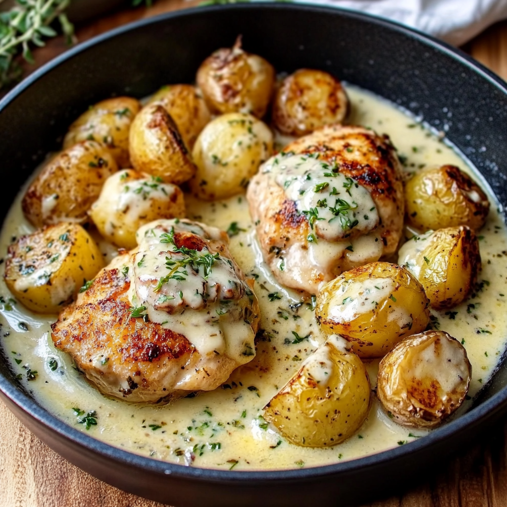 Sear the chicken first for a golden crust, then roast the potatoes while you prepare the creamy sauce. This method ensures everything cooks evenly and delivers maximum flavor.