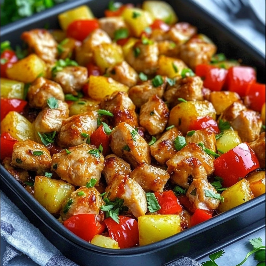 Toss it All Together : In a large mixing bowl, combine the chicken pieces with bell peppers, onion, and pineapple chunks. Pour over the sauce and toss everything enthusiastically until well coated.