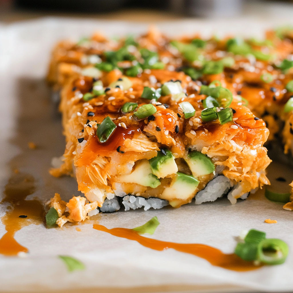 Layer Your Dish: Preheat your oven to 350°F (175°C). In an oven-safe baking dish, spread half of the cooked sushi rice evenly on the bottom. Layer half of the filling mixture on top.