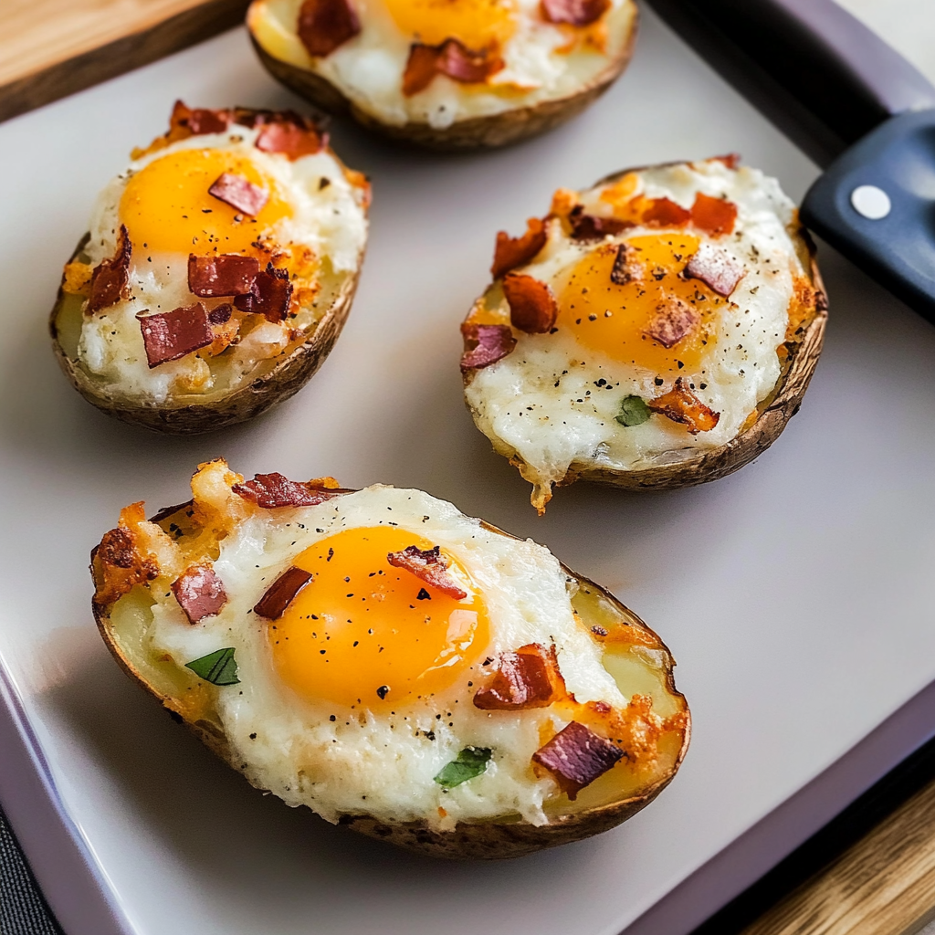 **Top with Eggs**: While they bake, fry up some sunny-side-up eggs in a nonstick skillet. Place one atop each loaded potato right before serving—this is where things get heavenly!