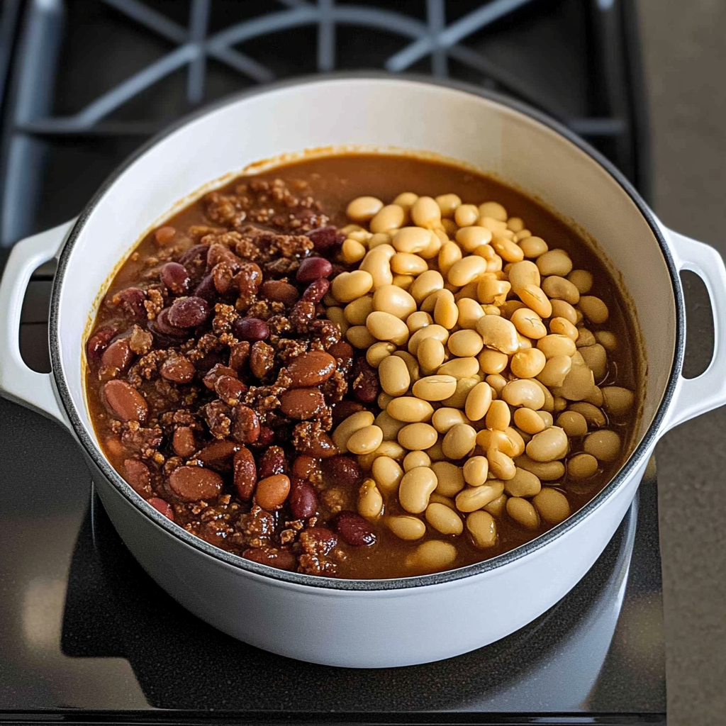 Mix in Beans: Drain and rinse kidney and pinto beans before adding them along with ketchup, brown sugar, mustard, Worcestershire sauce, chili powder, cumin, salt, black pepper, and water or broth.